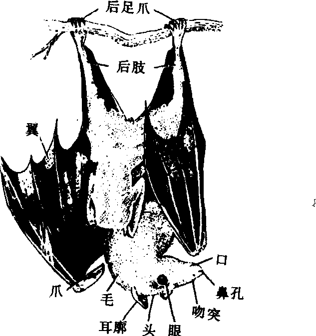 图385 狐蝠 狐蝠fruit bats哺乳纲,翼手目,狐蝠科。体型比一般蝙蝠大,体长约40 cm,两翼展开长一般超过150 cm。尾短或无尾,狐脸,大眼。第1、2指都有爪。多数以果实为食,对果园有害。分布于东半球的热带、亚热带地区。中国西部有狐蝠(Pteropusgigenteus)。另有莱氏狐蝠(P.lylei ),见于云南。台湾狐蝠(P.dasymallus),产于台湾。 |