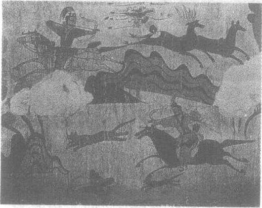 | 释义 | 狩猎图壁画高句丽(公元4世纪)。纵110厘米,横135厘米。吉林省集安县舞踊墓墓室西壁左侧壁画。此图以绵延的山峦为界,分上下两层,上层一位冠插羽毛、着红襦黄裤的猎人骑在奔驰的马上,他侧身回首,上箭拉弓,欲射一对奔鹿。下层的两位骑手装束与前一位猎人类似,一位腰挎箭囊,拉弓瞄准前方一只飞跑的猛虎,马旁一只猎犬,狂叫着奔向猎物。画面的右下侧也有一位猎手在拉弓。此图场面紧凑,富有生气,射猎时紧张的气氛通过马、鹿、虎、猎狗足不沾地的狂奔得到渲染。猎手们心神镇定,姿态潇洒矫健,表现出他们的勇敢强悍。此图笔法有力,设色深沉,其艺术与远在万里之外的敦煌莫高窟第249窟西魏狩猎图相类似,由此可见魏晋时期艺术传播之广。