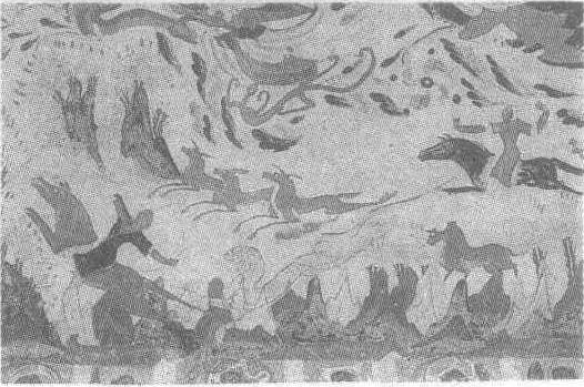 狩猎图壁画西魏。甘肃省敦煌县莫高窟第249窟窟顶北披壁画。此为北披所绘图案的局部。山峦之间正在进行扣人心弦的狩猎活动,一穿交领黑衫的猎手骑在马上,骏马扬起前蹄,猎手回首张弓,目标为身后的一只老虎。猛虎在生死关头为求得生存作最后一搏,它四肢腾空,挺身引颈,张开大口,向猎手扑去。情节生动,令人似闻马蹄声声和猛虎长啸的回响。画面的上方还有一穿红衣的猎手,他手持镖枪,在追逐一群黄羊,黄羊惊恐地急促奔跑。画面色彩鲜艳,将狩猎的激烈场景烘托得十分醒目。其中黄羊和猛虎的形象绘得最为生动。黄羊被厚重的土红色彩填涂,身姿矫健轻盈,肢体细长而夸张,充分显示了这种灵巧而擅长奔跑的动物的特性。图中的猛虎身体虽未重色填塗,但土红色简单而灵活的数笔白描勾勒,将它刻画得栩栩如生。