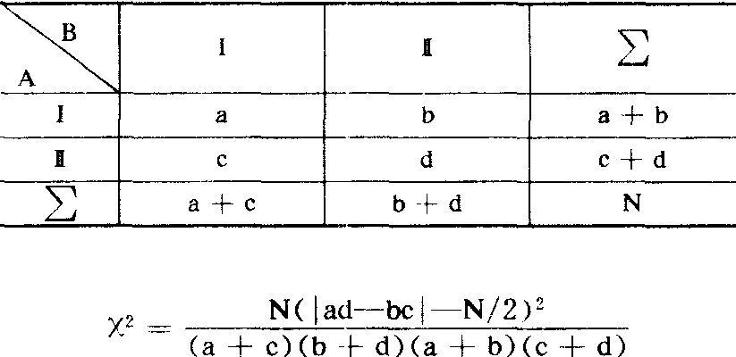 设H0学生报考师范大学的态度与家庭经济状况独立(或无关)。若用前部分公式计X2值,则先计理论值fe=ni.n.j/N,并把结果写入表中括号内;若用后部分公式计(此法较为准确),则可直接代入公式: ![]() 依f=(3-1)(3-1)=4及a=0.05查X2分布表得X(4)0.052=9.49,因X2>X(4)0.052,故拒绝H0,即学生报考师范大学的态度与家庭经济状况有关。 在表1中,当A、B均为二种可能性时,表1为2×2的列联表(见下表)。此时可用下式计X2值: ![]() 当检验结果为拒绝H0时,则可用下式计算这两种分类准则之间的关联程度 ![]() 式中 X2——所计得的值 N——总次数 C——列联系数 在上例中把X2=11.423及N=150代入上式得: ![]() 此处无需对C再作显著性检验。列联系数是两类准则关联程度的一种测度。 独立性检验关于两个对象(事件,属性或随机变量)独立的统计假设的检验,最常用的有:一、对于大样本,是皮尔逊x2检验;二、对于小样本,是基于超几何概率的直接检验,正态相关分析和等级相关分析,在一定意义下也可以处理独立性检验问题。常被应用于测验分数统计中。 |