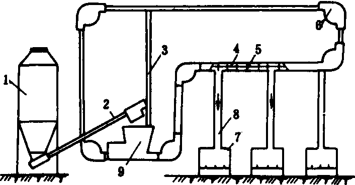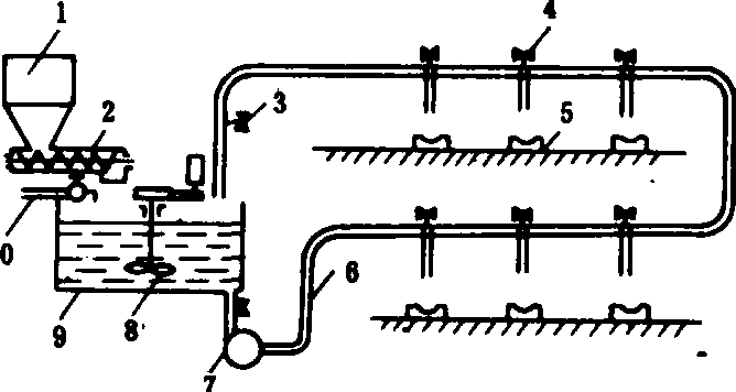 图3 管道喂饲设备 1.料箱; 2.配料螺旋; 3.回料阀; 4.放料阀门; 5.饲槽; 6.输料管; 7.输料泵; 8.桨式搅拌机; 9.搅拌池;10.自来水龙头 |