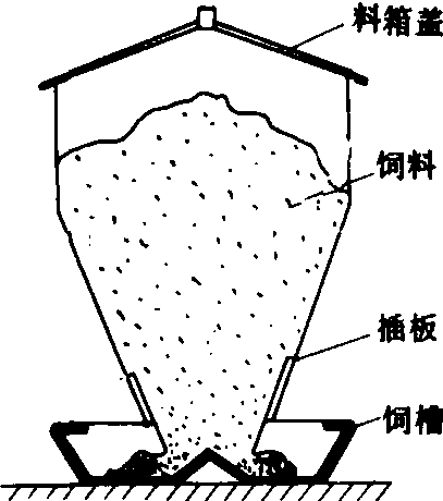 图1 索盘式喂饲设备 1.料塔; 2.升运器; 3.回料管; 4.钢索; 5.刮板;6.转角轮; 7.自动饲槽; 8.落料管; 9.料仓 自动饲槽如图2,饲槽上方的料箱可贮存5~7天的饲料,饲料靠自重流入饲槽,供猪采食。料流大小由插板调节。为防止料箱内的饲料架空,在料箱内有一根可拨动的铁链或铁杆,其端部露在插板口。猪只采食时,拨动此链条或铁杆,使箱内饲料源源流出。饲槽上部有盖,防止雨水侵入和雀鼠偷食,饲槽可制成单面的或双面的,每侧有4~5个采食位置,每个采食位置可供4~5头猪轮流采食。