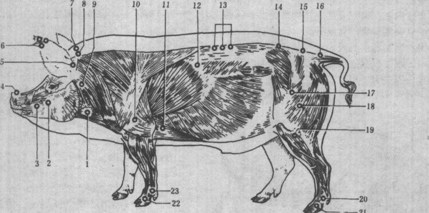 图1 猪的肌肉及穴位 猪头部穴位 共有穴名25个。天门、鼻梁、承浆和大风门等穴为正中一穴,其余均为左右侧对称取穴。其中耳尖、山根、玉堂和承浆等穴为血针, 卡耳穴是吊黄疗法的施术部位, 天门、耳尖、山根、开关、风门、玉堂等穴临证较为常用, 安神穴是猪电针麻醉手术常用的穴位。
