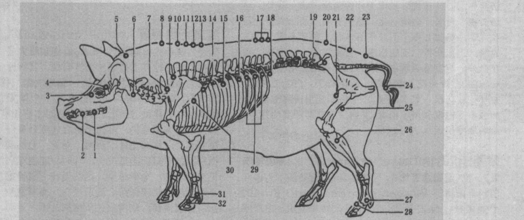图 2 猪的骨骼及穴位 猪躯干穴位 共有穴名39个。刮喉、刮肋为刮痧疗法部位, 颈黄、莲花穴为巧治术的施术部位, 尾本、尾尖穴为血针, 其余各穴为毫针扎刺点。大椎、苏气、断血、肾门、百会、脾俞、关元俞、肺俞、海门、阳明、尾尖、后海、脱肛等穴临证较为常用。 猪前后肢穴位 共有穴名32个,前后肢各16个,均为左右肢对称取穴。前肢的抢风、前缠腕、涌泉、前蹄头和前蹄叉等穴临证较为常用,其中前缠腕、涌泉、前蹄头三穴是血针的扎刺点,刮泽和七星穴常作刮痧疗法的施术部位。后肢的后三里、后缠腕、滴水、后蹄头和后蹄叉等穴临证较为常用,其中曲池、滴水、后缠腕和后蹄头可采用宽针放血,刮曲穴是刮痧疗法的施术部位。