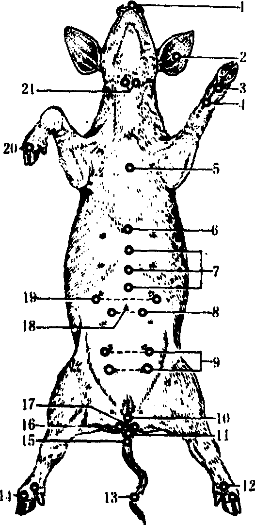 | 释义 | 猪腧穴acupoints of pigs对猪体行针施灸治病的刺激点。猪病针灸治疗经验长期在中国民间流传。1957年江西省总结整理出《兽医针灸术在猪病方面的应用》。此后江西省中兽医研究所编著的《实用兽医针灸学》、《猪病针灸手册》等总结了华东、中南和西南各地中兽医的经验, 又经《中国兽医针灸学》及《中国针灸荟萃·兽医针灸卷》等整理增补, 现已积累了96个猪腧穴的有关资料(图1~3), 分部列穴。