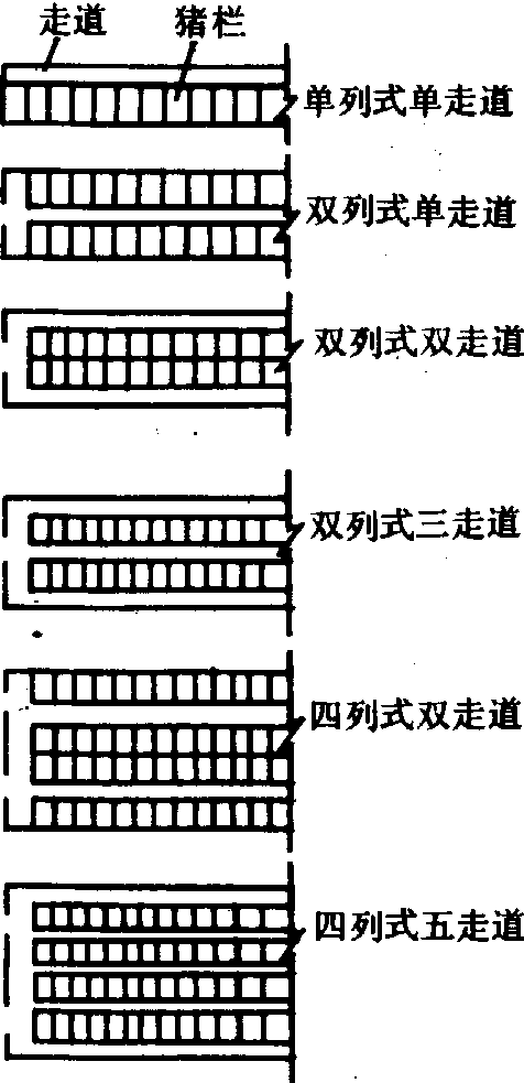 猪栏排列形式 设备和设施 猪舍内设备和设施包括送料、喂料、饮水、清粪设备以及猪栏、粪沟、漏缝地板、通风、采暖、照明、降温等设施。设备和设施的配套程度和现代化水平视养猪场的投资、规模、管理水平和环境等条件而有所不同。❶猪栏分单体限位猪栏和群饲猪栏两种,每个猪栏面积根据猪种、猪的生长发展阶段和群饲只数而定,群饲猪只的占栏面积通常如表所示。猪栏多以普通钢管焊接或装配而成,也有钢筋混凝土板猪栏和砖墙漏空猪栏。 ❷粪沟断面一般为矩形,水冲清粪时常采用U形断面,内表面光滑,抹面一般用高标号水泥砂浆,沟底有一定的纵向坡度。 ❸粪沟上的漏缝地板主要是为保持猪栏内清洁、干燥而设,一般为钢筋混凝土预制板或以金属材料制作,也有用塑料或陶瓷材料制作,缝隙间距和板条宽度视猪只大小而定。 ❹猪舍自动饮水装置种类很多,常用的有鸭嘴式、乳头式和杯式饮水器三种,每种又有多种构造形式,并按猪只的生长期龄分为大小两种规格,各种饮水装置均有定型产品。 ❺猪舍饲喂装置包括饲料输送机、喂料车、食槽(包括自动食槽)。饲料输送机的形式有卧式搅龙式(运距<30米),链式(运距<100米),螺旋弹簧式(运距<150米)和塞管式(运距<500米)等,发达国家最常见的是后两种,中国亦有使用。喂料车在装有饲料输送机的养猪场仅作为辅助送料设备,主要作用是将饲料从饲料塔送到各猪舍各栏,在未装有饲料输送机的养猪场,也作为从贮料间到各猪栏运送饲料的主要工具。喂料车有机动喂料车和手推人力喂料车两种,有的喂料车还配有定量装置,以保证投料准确。食槽种类很多,根据各种猪的要求可做成不同规格,有砖砌食槽、混凝土食槽和金属食槽等,较为现代化的养猪场多采用自动食槽。自动食槽有长方形、圆形两种,长方形食槽由钢板制作,表面喷塑,食槽大小有几种规格,可做成供单栏使用的单面食槽和两栏共用的双面食槽;圆形食槽的饲料桶通常由不锈钢制成,可上下移动以便控制和促成饲料流落。自动食槽便于实现自动化送料,清洁卫生,可控制投料量而又能达到全无自由采食的目的。 ❻猪舍基本上不采暖,成年猪舍通常只从猪舍屋面和围护结构上采取一些保暖措施,只有在分娩哺乳舍的分娩栏和断乳仔猪舍的猪栏内才采取局部采暖措施,多数采用红外线加热器或电热保温板,少数养猪场也有采用局部电加热地板或热水管加热地板或土坑采暖。 ❼猪舍一般为自然通风,必要时辅以机械通风,通常做法是两侧设风机,屋顶安装风帽。 ❽多数地区猪舍不设降温设备,炎热地区有的设普通水管喷淋,有的则利用湿冷垫降温。 ❾猪舍采光一般为自然采光,人工照明装置仅在夜间使用。但大跨度猪舍需要机械通风和人工照明。密闭式猪舍的采暖、通风、照明,均采用自动化控制设备完成。 每头猪占用猪栏地面面积的推荐数值