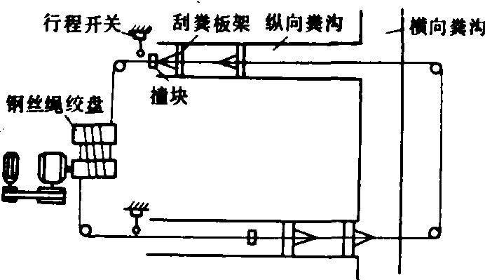 图1 往复式刮板清粪设备 闸门水冲清粪装置 平时在粪沟内保持一定水量,定时打开闸门用水清除粪便。水冲清粪用的粪沟由砖、水泥、钢筋水泥或陶瓷预制件构成,沟底为半圆形、直角形或梯形,粪沟上部宽70~100厘米,铺以缝隙地板。沟的始端深60~70厘米,沟底有0.005~0.01的坡降,与横向粪沟连接处设有闸门,此闸门应便于开启和关闭,关闭时应严密。 平时闸门关闭,沟内放水,深5~10厘米,猪排泄的粪便通过缝隙地板不断落入沟内,每隔3~4天打开闸门,放水冲洗,粪水混合物便由舍内粪沟冲出,经横向粪沟流入贮粪池,然后关闭闸门再次向粪沟内放水。此方式工作可靠,用水少,每头猪的日耗水量为1~1.5升,闸门还能防止冷空气进入舍内,但耗工时较多,不便于自动化。 翻箱式水冲清粪设备 如图2,它利用水箱自动倾翻造成的瞬时水流将粪沟内的粪便冲走,常与缝隙地板猪栏配合使用。盛水箱架设在畜舍一端粪沟的缝隙地板上方,其宽度与粪沟宽度相等,容量由饲养密度和粪沟长度决定,可为1吨或0.5吨。水箱两侧的半轴将水箱支承在导轨上。非工作状态时,水箱不盛水,其重心在两个半轴的左侧,靠盛水支点保持稳定。工作时,打开水箱上方的水龙头,随着水箱水面的上涨,重心逐渐右移,当水箱重心超过半轴中心时,便自动倾翻,水即冲入缝隙地板下面的粪沟,将粪便冲走。水箱倾翻到一定角度后,遇到倾翻支点,便停止转动,水箱内的水倒空后,水箱反转复位,进入下一个工作循环。