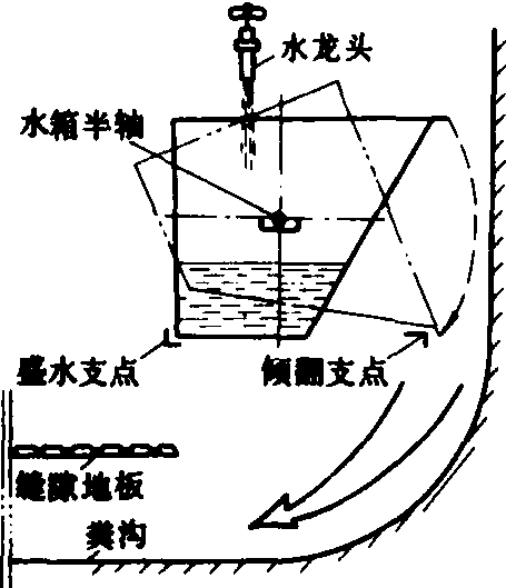 图2 翻箱式水冲除粪设备 调节水龙头的流量,可改变水箱的倾翻间隔,通常夏季每日冲洗3次、冬季每日冲洗2次。该设备自动化程度较高,但耗水量较大,平均每头每日约耗水15升。 |