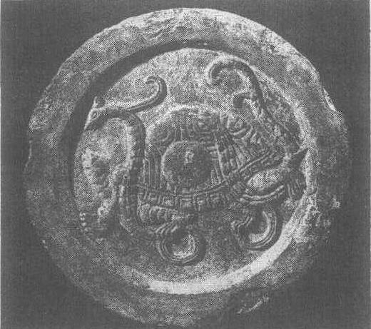 | 释义 | 玄武纹瓦当西汉。面径19厘米。1958年陕西省汉长安故城遗址出土,陕西省博物馆藏。瓦当上的玄武纹为凸起浮雕式。其蛇颈弯曲,张口吐舌俯视下方,龟背高耸,长尾上扬作爬伏状。玄武,四神之一,形象为龟蛇的合体,象征着北方。有研究者据《史记·高祖纪》“未央宫内北有玄武阙”的记载推测,玄武纹瓦当为未央宫北阙瓦当。瓦当见“‘羽阳千岁’瓦当”条目。