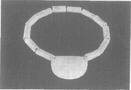 | 释义 | 玉串饰铜石并用时代良渚文化。浙江省杭州市反山出土。浙江省文物考古研究所藏。此件串饰由12个玉管和一块玉饰组成。玉管长短略有差别,玉质为白色,上带茶色斑点。玉饰类似半圆形,正中以极细的刀工刻出简化的神人兽面纹,它代表着良渚文化的神徽。此件玉串简洁明朗,图案精美,刀工绝伦。良渚文化见“方柱形玉尖状器”条目。