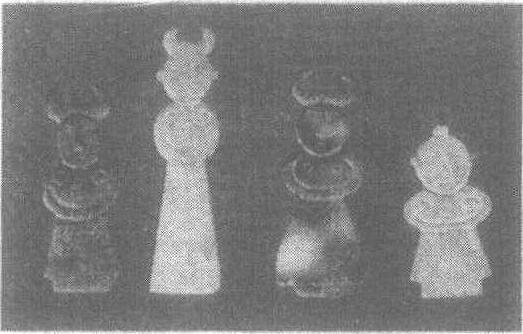| 释义 | 玉人(4件)战国中期。最高4厘米,最矮2.5厘米。1978年河北省平山县中山国国王陪葬墓出土。河北省文物研究所藏。4件玉人所用玉料呈色不同,有的青绿,有的褐黄,作板状体。4人服装基本相同,束腰窄袖,上衣无纹饰,下衣以大格纹和菱格纹相间做装饰,皆拱手站立。其中3人为成人形象,发式奇特,呈牛角形。另一人为童子,身材矮胖,头梳一髻。同时出土的这类玉人共十几件,装束皆如此。有人推断这是边疆民族的装束,还有人推断这是戏装,是研究中山国人的风俗习惯和服饰穿戴的极好资料。