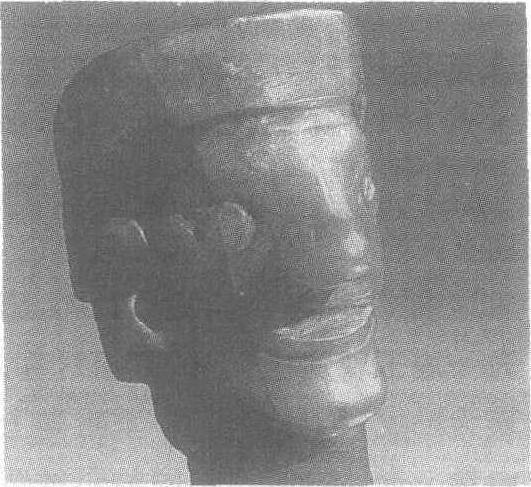 | 释义 | 玉人头饰春秋早期。高3.8厘米,宽2.5厘米,最厚1.8厘米。1983年河南省光山县宝相寺黄君孟墓出土。河南省信阳地区文物管理委员会藏。玉料为黄褐色,以圆雕手法琢制一正面人头。头戴两侧出檐的冠帽。脸形消瘦,臣字形目,鼻头硕大,耳佩环,双唇厚,面似带笑,风貌古朴。颈部为筒形,头至颈的中心有一直穿圆孔。天津艺术博物馆藏品中有一类似的人首佩。