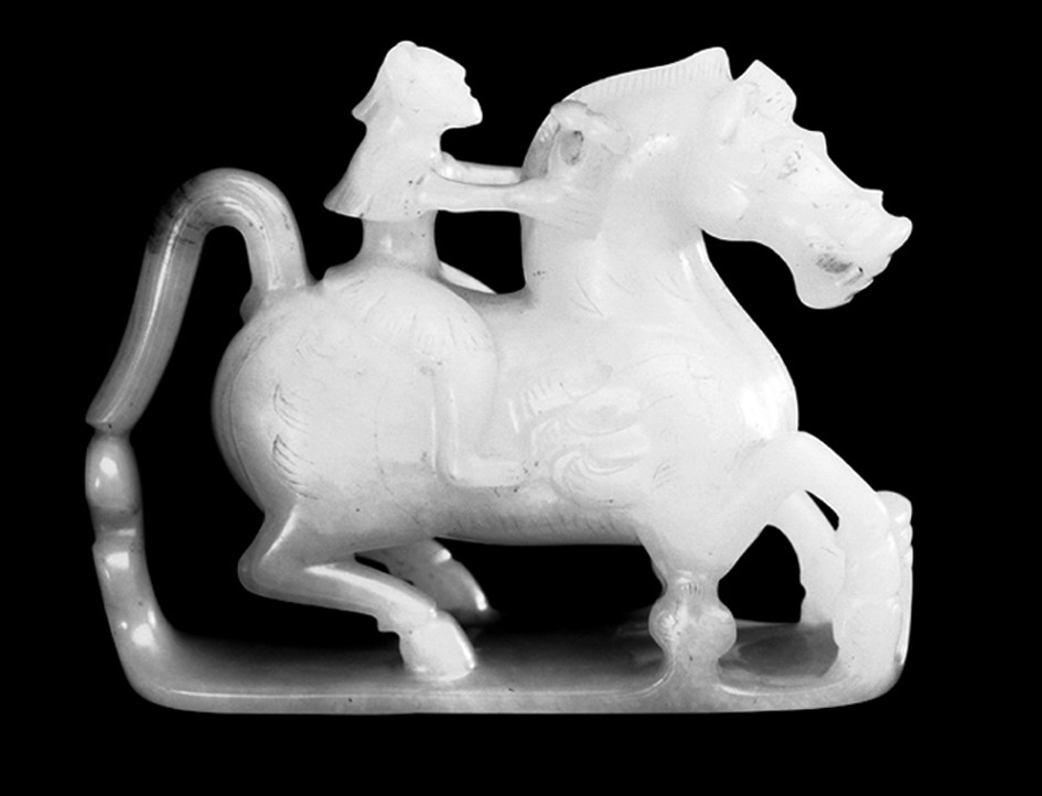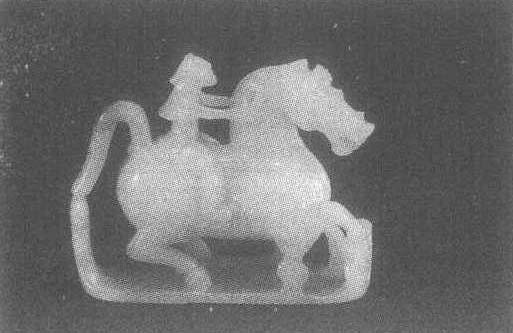 | 释义 | 玉仙人奔马西汉早期。高7厘米,长8.9厘米。1966年陕西省咸阳市汉昭平陵遗址出土。陕西省咸阳市博物馆藏。玉料为白色,质地坚硬,温润细腻,圆雕而成。马勾首嘶呜,双耳如锥,鬃毛齐整,身躯极为健壮僄悍,并阴刻翅膀。四肢弯曲。与踏板相连,右前蹄翅起,作奔腾飞跃状。马背上骑一人,头束巾,穿短衣,双腿夹紧马肚,两臂前伸触及马颈,神气活现。此玉雕琢细腻,骏马骨肉停匀,其内在的气质也刻划了出来,是汉代玉雕精品。有人从此马的神态判断,玉雕表现的是“天马”。《汉书·张骞传》:“‘神马当从西北来’。得乌孙马好,名曰 ‘天马’。”古代诗人对西域来的骏马(即天马)也曾有极为生动细致的歌咏。