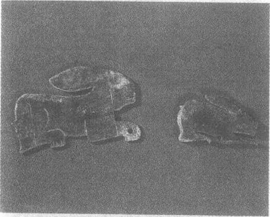 | 释义 | 玉兔(2件)西周中期。大件高3.2厘米,长4.7厘米。1974年陕西省宝鸡市茹家庄伯墓出土。陕西省宝鸡市博物馆藏。两兔皆以褐黄色玉片制成,取兔的侧面剪影像。圆眼,双耳后拢,短尾。小兔后腿屈蹲,前爪伸出,头向下探,似在寻找食物。大兔首微昂前视,其身姿似作腾跃状。两兔的刻画各有优劣,大兔的头部和耳朵线条轮廓更为流畅,写实性强;小兔的后背及臀部弧度更大,显出它的肥硕可爱。