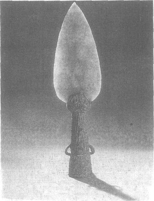 商。古兵器。长18.4厘米,宽4.9厘米。北京故宫博物院藏。此矛制作罕见,即在青铜骹上镶入较锋利的玉质锋刃。骹部饰饕餮纹和蕉叶纹,两侧各有一小系环。矛是古代刺兵器的一种,一锋两刃,中脊隆起,骹上为锋刃,下装柄,呈直筒状,其旁常有环耳。