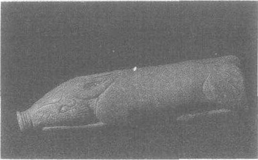 | 释义 | 玉猪东晋早期。长11厘米,宽2.5厘米。江苏省南京市中央门外郭家山墓葬出土。江苏省南京市博物馆藏。玉料为青色。猪系圆雕而成,作卧伏状,肢体均前伸,头伏于前肢之上。猪形体细长,头尖,以阴线刻嘴、目和鬃毛,两耳抿于脑后,两端(嘴和臀部)齐平。颌及尾椎各有圆穿可佩系。汉以后的墓葬中多发现玉猪作为随葬品,时代不同其形制略异。此玉猪为东晋时期的代表作。