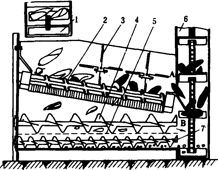 图1 玉米剥皮机 1.喂入装置; 2.剥皮辊; 3.叶轮式压送器; 4.排叶螺旋输送器; 5.筛网; 6.输送装置; 7.籽粒螺旋输送器