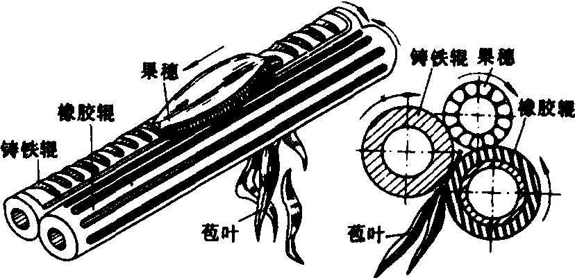 图2 剥皮辊 压送器的作用是增加玉米果穗与剥皮辊间的摩擦力,并推动玉米果穗下滑,从而提高剥皮装置的生产率和剥净率。压送器有叶轮式、链式、输送带式和凸轮式等类型,其中叶轮式压送器应用最广,其最大回转直径为240~350毫米,转速为40~60转/分。 玉米剥皮机对苞叶的剥净率可达95~98%,果穗上的籽粒掉粒率为4~5%,籽粒表面损伤率为0.15~0.25%。每对剥皮辊的生产能力为0.5~0.7吨/小时,需功率0.7~0.8千瓦。 玉米剥皮机corn husker剥去玉米苞叶的机械。由喂入斗、剥叶辊轴、风扇、果穗输送器等组成。工作时,剥叶辊轴相对旋转,将落在辊轴上的果穗苞叶剥下,由风扇吹至机外,果穗则由输送器送至机外装袋。 玉米剥皮机剥去玉米穗苞皮的机器。由喂入斗、剥皮辊轴、风扇、果穗输送器4部分组成。分固定式和移动式2种。剥皮辊成对配置,直径68~103 mm,与水平面成10°~12°倾角,两轴高度差约35mm。剥净率可达95%~98%。每小时可剥玉米0.5~0.7 t。 |