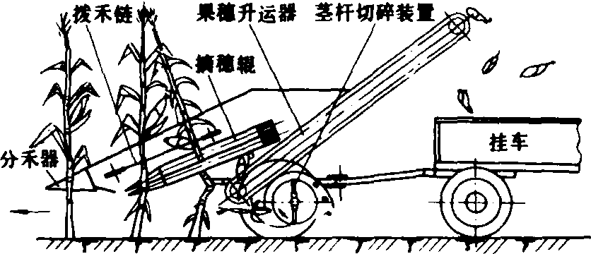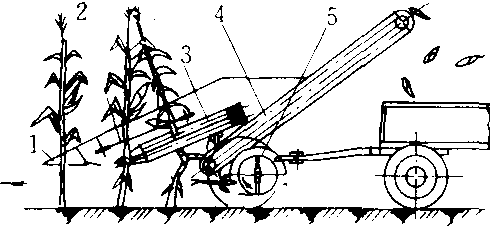 卧辊式玉米摘穗机 1.分禾器 2. 拨禾链 3. 摘穗辊 4. 果穗升运器 5. 茎秆切碎装置 玉米摘穗机采摘玉米穗的机具。由分禾器、拨禾器、摘穗辊及输送器4部分组成。分单行和双行2种。按摘穗辊的配置状态分卧辊式和立辊式2种。卧辊式2个摘穗辊间有约35 mm的高度差,摘穗辊外径一般为72~92 mm,长度900~1200 mm,转速为700~900 rad/min。立辊式的摘穗辊直径为75~85 mm,长度约300~350 mm,拉茎辊直径90~135 mm,长度300~350 mm。 |