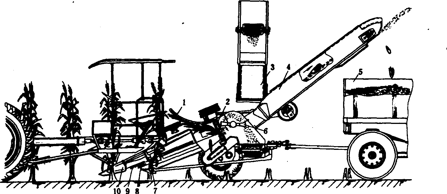 图2 立辊式玉米摘穗机 1.挡禾板; 2.摘穗辊; 3.碎茎秆抛送器;4.果穗升运器; 5.挂车; 6.茎秆切碎装置; 7.切割器; 8.夹持提升链;9.扶禾链; 10.分禾器