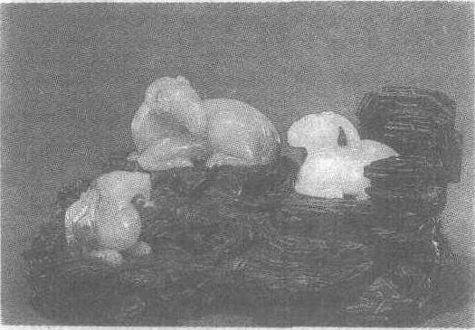 | 释义 | 玉羊宋。一只高4.3厘米,长7.2厘米,另一只高3.7厘米,长4.7厘米,第三只高3.4厘米,长5.6厘米。台北故宫博物院藏。三只羊分别由白玉和黄玉雕琢,均呈卧伏状。一只颈间挂绳索,首微昂起;一只独角,有髯,颈后有三撮毛,注视着侧上方;另一只踡身回首。三只玉羊制作精良,配一山石状木座,相互之间似在问答呼应,形象温润可爱。“羊”谐音作“祥”,玉雕三羊寓意吉祥,象征“三羊开泰”“吉祥如意”。