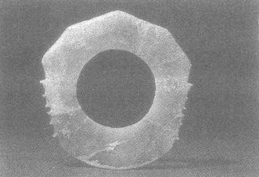 | 释义 | 玉钺青铜时代二里头文化三期。最宽9.6厘米,孔径5.2厘米,厚0.6厘米。1975年河南省偃师二里头出土。北京中国社会科学院考古研究所藏。玉料呈青绿色,上有浸蚀痕迹,形制类似圆璧。刃分作四段,均为两面磨成。刃两侧近直,每侧各有6个凸起的锯齿形牙。玉石钺较为常见,但这种圆形钺形制比较特殊,此墓共出土两件。另外,北京故宫博物院解放后也曾收集一件断为3节的圆形钺与这两件出土物类似。二里头文化见“饕餮纹玉柄形器”条目。