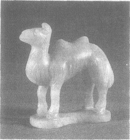 唐。高5.9厘米,长5.7厘米。天津市艺术博物馆藏。黄玉较为少见,而这件精巧的骆驼恰是以黄玉琢制而成。玉质温润。骆驼呈站立状,四足踏于银锭形踏板之上,头为三角形,双耳抿于脑两侧,昂首视前方,双驼峰高高地耸起,颈腹等部位的鬃毛以形象的阴线装饰。刀工娴熟,形象真实自然。