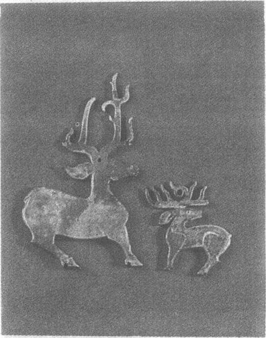 | 释义 | 玉鹿(2件)西周中期。大者高8.4厘米。1974年陕西省宝鸡市茹家庄伯墓出土。陕西省宝鸡市博物馆藏。玉料呈黄褐色,体扁平,为鹿的侧影影象。两鹿鹿角高耸,枝杈繁茂。大鹿为臣字形目,昂首前视,小鹿为圆形目,回首瞭望。将两鹿相对摆放在一起,形象十分有趣。有如大鹿率小鹿漫游在茫茫草原上,大鹿停步观察前方,小鹿顺意行动。作者以夸张的线条构出双鹿的形体,并将这种食草动物温驯而优雅的性格通过线条表现出来。弧形阴线表示身体的肌肉。肢、蹄的关节部位刻画精致,能表现出跋涉时的力度。一般雄性鹿有角,而驯鹿雌雄均有角。此大小鹿均有角,可能是驯鹿母与子的形象。