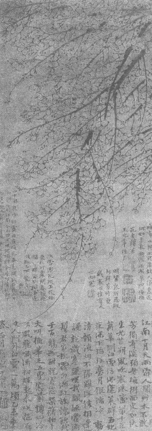 | 释义 | 王冕墨梅图轴元。王冕(见《王冕墨梅图卷》条目)绘。纸本墨笔。纵68厘米,横26厘米。上海博物馆藏。此图描绘一簇倒垂的春梅,枝条茂密,纤长细劲,梅梢微微曲转,仿佛沐浴在和煦的春风之中、主次分明,前后交叠,富有韵律感和节奏感。枝头裹满了繁密的花朵,有的蓓蕾含苞,有的展瓣怒放,明洁圆润,犹如大大小小的珠玉,正侧俯昂,千姿百态,虚实相托,密中有疏。画幅中飘逸着温馨的清香。梅枝下方有作者题诗五首。此图梅枝以润墨挥写,梅朵用细笔勾圈,再以焦墨点苔、描蕊,笔法精妙,墨色鲜明。花鸟画自北宋以来,其构图就十分注意画面的均衡、协调,疏密结合以及情节上的相互呼应,但其表现形式却往往因循守旧,少有创新,而王冕则不然,他的作品在设景布势上颇为大胆,他画墨梅,师法北宋扬无咎,但宋人作梅多疏枝浅卉,此图则以密花繁枝见胜,且风格劲健、洒脱、热烈、流动,毫无雍滞之感。显示出画家深厚的艺术修养和娴熟的笔墨技巧。图中款署:“乙未年春正月朔写于草堂。”乙未为至正十五年(公元1355年),王冕时年68岁,正处于艺术颠峰时期。此图深为后人珍视,诗塘及裱边四周,相继有明人祝允明、陆深、谢承举、文徵明、薛章宪、王宠、徐霖、王韦、唐寅、陈沂等人题诗。曾由近人庞元济收藏。