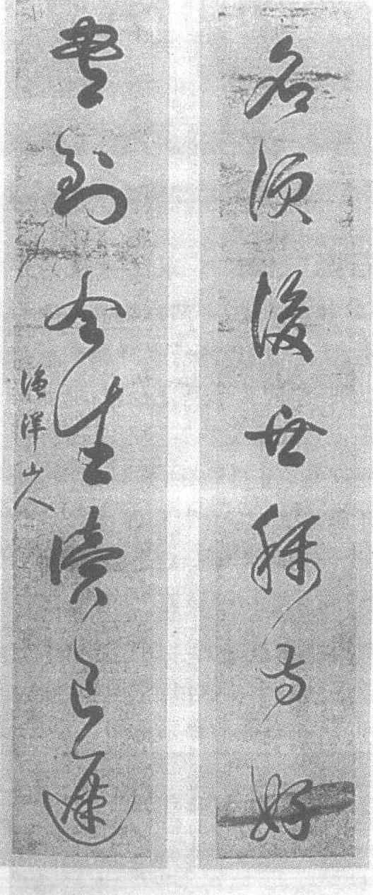 | 释义 | 王士祯草书轴清。纸本。纵165.3厘米,横26.6厘米。山东省济南市博物馆藏。王士祯(崇祯七年—清康熙五十年,即公元1634—1711年),初名士祯,卒后,以避清世宗雍正帝胤祯讳,谕改士正。字子真,又字贻上,号阮亭,别号渔洋山人,山东新城人。清顺治十五年,即公元1658年进士,历任扬州府推官、户部郎中、刑部尚书,谥文简。礼贤下士,尤喜奖掖后进。博学好古,能鉴别书画、鼎彝之属,精金石篆刻,诗为一代宗工,与朱彝尊称南北二大宗,号“南朱北王”。书师法晋唐,空灵潇洒,自然秀润,富有韵味,风格有似于他的诗作。宋荦《王渔洋墓志铭》谓阮亭:“书法高秀似晋人,雅不欲以此自多,人以绢素求书,辙令弟子代。唯二三同好问答必亲作,其于迹多藏弃之。”清王宏撰《砥斋题跋》云:“阮亭于书得其宗人雅宜法,外拓特胜。”清陈奕禧《隐绿轩题跋》云:“褚河南《枯树赋》,今人惟新城总宪学之极得其神。”近人马宗霍《霋岳楼笔谈》云:“渔洋行书,奕奕有雅致,诗人之书也。”一生著作宏富,著有《带经堂集》、《皇华纪闻》、《池北偶谈》、《香祖笔记》、《居易录》、《分甘余话》、《粤行三志》、《泰蜀驿程》、《渔阳诗话》、《陇蜀余闻》、《国朝谥法考》等。《清史稿》卷二百六十六有传。此幅是录王渔洋草书联:“名须后世称方好,书到今生读已迟。”笔势流转,宛如行云流水,用笔利落通达,引带流畅,风流蕴藉,方圆兼备,体现了王士祯书法的天然妙趣。