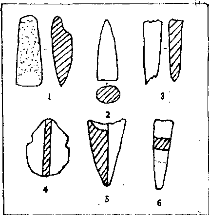 (1.石斧、2.石矛、3.石凿、4.石网坠、5.鬲足、6.鼎足) |