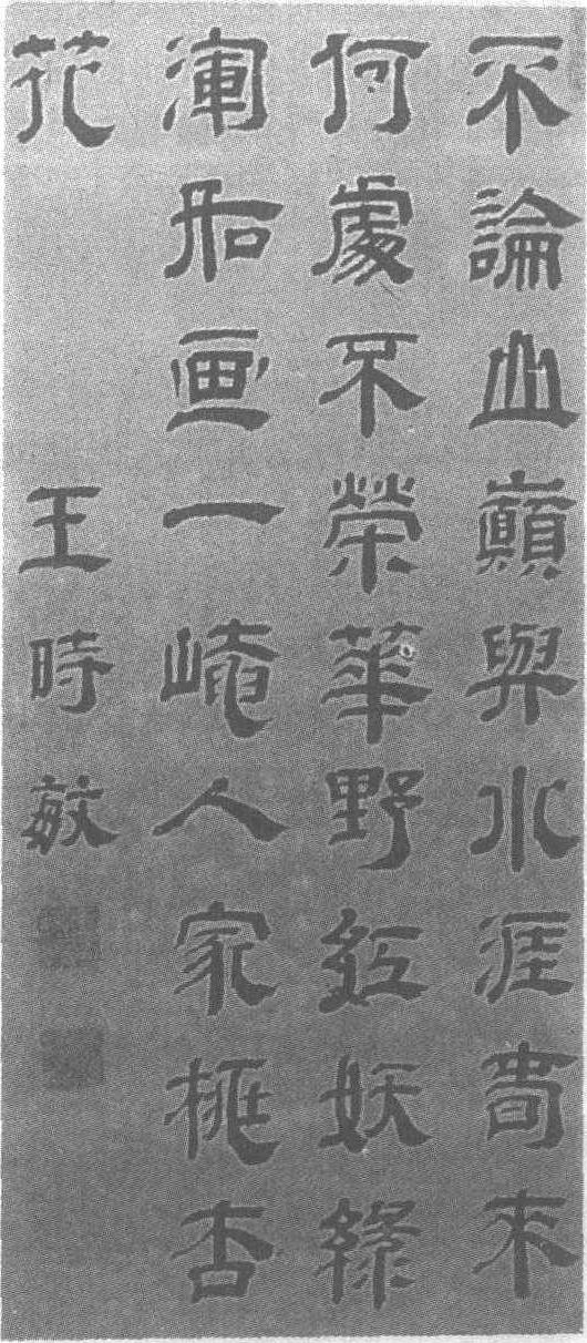 | 释义 | 王时敏隶书七言绝句轴清。纸本。纵118.6厘米,横48.5厘米。上海博物馆藏。王时敏(明万历二十年—康熙十九年,即公元1592—1680年),初名赞虞,字逊之,号烟客、偶谐道人、懦斋、西田主人,亦号归村老农,又称西庐老人,太仓(今江苏省)人。以父锡爵荫入仕,历任尚宝卿、太常寺少卿等官,崇祯十三年(即公元1640年)退职隐归于村。南明福王立,起升太常太卿,引疾疏辞,入清后未仕。明清之际著名画家,与王鉴、王原祁、王翚有“四王”之称。与董其昌、陈继儒切磋画理,遍摹宋元名迹,山水笔墨苍润松秀,为清初“四王”之首。擅书,行楷得自《枯树赋》。清秦祖永《桐荫论画》云:“烟客行楷抚《枯树赋》,隶书追秦汉,榜书八分为近代第一。名山梵刹,非先生书不足为重也。”著有《王烟客先生集》、《西庐画跋》。《清史稿》卷五○四有传。此幅隶书“不论山巅与水涯,春来何处不荣华。野红妖绿浑如画,一崦人家桃杏花。”计4行28字,款署“王时敏”。笔意峻利,结体拙重方整,结构开中有合,用笔古朴凝练,字迹苍劲雄健,风韵洒脱,浑然一体,既保留了汉、魏体的特点,又有强烈时代特性,体现了王时敏在书法艺术方面独特的秉赋。