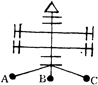 | 释义 | 王棋又称“粪缸棋”,广西壮族民间普遍流行棋种之一。棋格如图:2人对弈,1人1子,布在A、C点上,B为“粪缸”,系罚子点。走子以出手指猜数为凭,甲方要单数、乙方要双数,中了谁的数,谁移子向前走一步,行子必经每条线的交点,子到尽头无路走时,须返回中轴线交叉点继续向上走,先达顶点者“当王”为胜。如果前方子被后方子追上,则前方子“滚下粪缸点”,重新起步往上爬。此棋纯属儿戏,适于幼儿开蒙学棋。