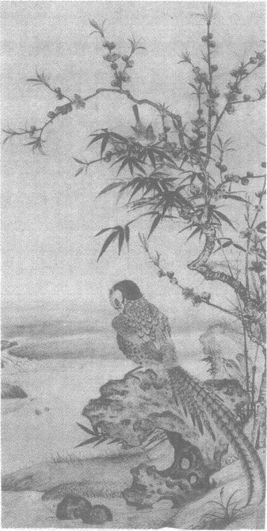 | 释义 | 王渊山桃锦鸡图轴元。王渊(见《王渊竹石集禽图轴》条目)绘。纸本墨笔。纵102.3厘米,横55.4厘米。北京故宫博物院藏。图中一道清流婉转坡前,泛起阵阵涟漪,岸草青青,秀石挺立,石上一只色彩斑斓的锦鸡侧头转颈,正在啄理肩头的羽毛,雌鸡立在石后回头返望。石旁细竹轻挺,枝叶疏秀,桃树枝干折转,花蕾初绽。一只山雀躲在枝头,拍着双翅,仰头鸣叫。远处,雾色朦胧,一片幽寂。此图用笔工细谨严,勾染结合。作者以浓淡不同的墨色描绘物象的质感:柔细的鸟羽、温厚的坡土、坚重的湖石、瘦硬的桃竹,以及鲜润的花萼、细嫩的新叶都表现得恰到好处。鸟雀神态自然生动,花木竹石淡雅清秀,既有黄(荃)家花鸟富丽端庄的气质,又有文人画疏淡雅洁的风格。画幅左下方款署:“至正己丑王若水为惠民作山桃锦鸡图。”下钤〈澹轩〉、〈王若水〉二印。至正己丑为公元1349年。图中并钤有〈子孙永保〉、〈海滨程氏〉等收藏印。