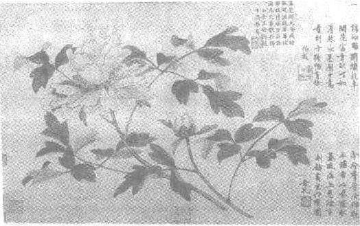 | 释义 | 王渊牡丹图卷元。王渊(王渊见《王渊竹石集禽图轴》条目)绘。纸本墨笔。纵37.7厘米,横61.6厘米,北京故宫博物院藏。此图绘一大一小两枝牡丹,小枝上的花朵含苞欲放,大枝上的花瓣迎风吐艳。王渊运用或浓或淡的墨线勾描牡丹的枝干、叶脉和花瓣,并用或深或浅的水墨涂染,以表现枝梗、花叶的质感、色泽、大小和阴阳向背。此图结构简洁,用笔工稳,是一幅令人眼目一新的墨花写意画。该图卷未署款,左下角钤〈王若水印〉一方,画幅中有王务道、伯成、希孔三家题诗,后纸有元人李升所书的“牡丹赋”一文。钤〈管氏家藏〉、〈南北东西只有相随无别离〉等藏印。该卷还曾经现代人张爰收藏。