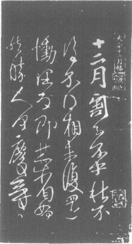 | 释义 | 王献之十二月帖为王献之草书的代表作。该帖由开始行楷书渐变为行草书,字多联属,笔势奔放,可见王献之善一笔书之长。帖中写的内容为:“十二月割至不中秋不复不得相未复还恸理反即甚如何然胜人何庆等大军。”原墨迹曾为宋代米芾所收藏,此帖宋代曹之格刻入《宝晋斋法帖》第一卷中。对唐代草书家张旭、怀素等人影响深远。