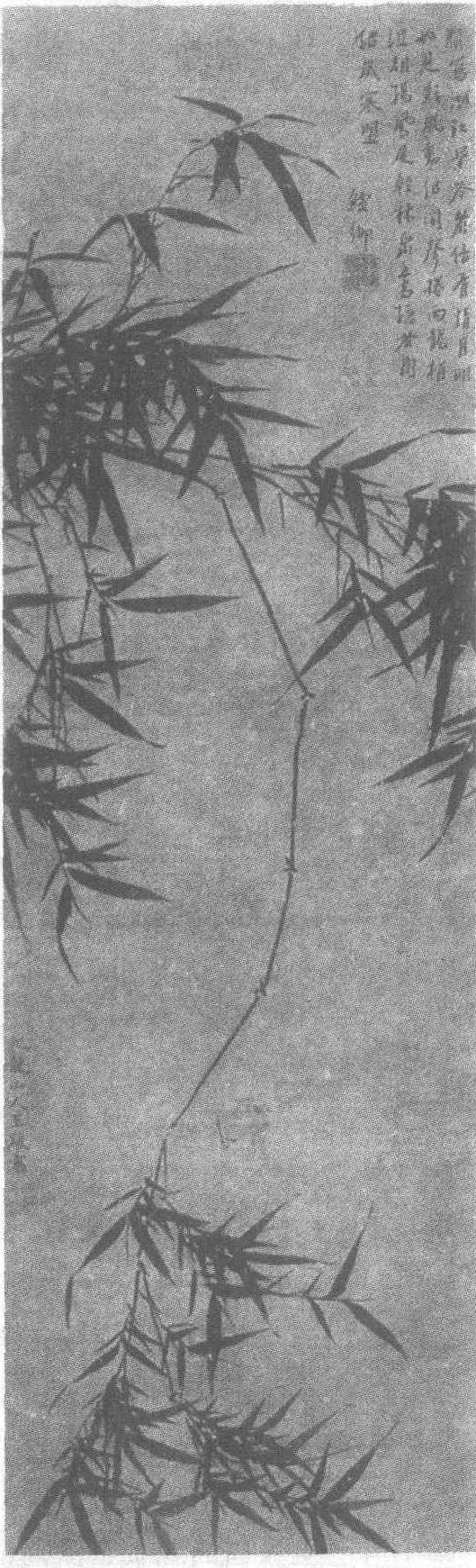 | 释义 | 王绂偃竹图轴明。王绂(见《王绂山亭文会图轴》条目)绘。纸本墨笔。纵93.7厘米,横26.7厘米。上海博物馆藏。此图绘一杈倒挂竹枝。细小的竹杈从画面上方左侧伸入图中,或横出,或抬昂,或下垂。竹叶挺劲,前后掩映,疏密相间。一竿长长的竹枝穿出竹丛,倒挂在半空中,纤细、轻挺,不出旁杈。竹梢曲转,嫩叶舒张,风姿绰约,秀逸潇洒。此图笔力遒劲,墨色凝重,而构图新巧,沉稳中透出一种纵横萧散之气。王绂的墨竹继承文同、柯九思、倪瓒等人的传统,并进一步发展了笔墨意韵,开创出元末明初的画竹新风。图中自题: “九龙山人王绂写。”从笔墨风格推断,此图应系王绂的晚年之作。图中有莫旦题五言律诗一首,裱边有黄易题签,曾由明项元汴、清邓氏收藏。