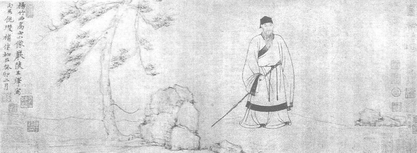 | 释义 | 王绎倪瓒杨竹西小像卷元。王绎、倪瓒绘。纸本墨笔。纵27.7厘米,横86.8厘米。北京故宫博物院藏。王绎(约公元1333—?年),字思善,号痴绝生,睦州(今浙江建德)人,后徙居杭州,笃志好学,雅有才思,少年时代即喜爱绘画,十二、三岁。“已能丹青,亦解写真,”后随吴中(今苏州)画家顾逵学艺,画技益进,以肖像画著名于时,“非惟貌人之形似,抑且得人之神气。”他还著有《写像秘诀》传世,是现存较早的中国肖像画理论著作。王绎主张画人物肖像必须严格按照客观对象的原貌去表现,作深入细致的观察,尤其应把握人物并不随时随地表露于外的精神气质,他反对要人正襟危坐式的写生方法,因为这样一来,被描绘的对象已呆似泥人,神气俱失了。他在总结自己创作经验时说:“彼方叫啸谈话之间,本真性情发现,我则静而求之,默识于心。闭目如在目前,放笔如在笔底。”早在东晋时,顾恺之就提出了“以形写神”的理论,指出“手挥五弦易,目送归鸿难”,苏轼、陈造等人也在画理方面对肖像画如何写神提出过与王绎类似的看法,但多数肖像画家却由于主观意愿及客观技法的限制,所作肖像仍然只是“肖而不妙”难以传神。王绎除肯定前人的见解之外,更专心于肖像画的创作,以扩大影响。同时还对表现技巧加以阐述。“彩绘法”一节则历举了人物面部的着色方法,及各种颜色的调配法,是我国色彩学方面的重要资料。王绎的作品流传很少,此图是一件能代表其绘画风格的优秀作品。小像所绘是南宋遗民杨谦。杨谦,号竹西居士,松江人。图中,他头戴软帽,身着长袍野服,杖策独立。面色详和,慈眉善目,额头、眼角堆着皱纹,颧骨突起,两颊内收,面形略见削瘦,花白的胡须垂撒胸前。小像以白描手法绘出,比例准确,衣纹用线圆劲有力,很有质感,人物面部以细笔勾描,略用淡墨烘染,生动传神,较好地表现了杨谦清廉谨慎的性格。倪瓒并为此图补景,以疏简的笔法,浅淡的墨色描绘出平缓的坡地,堆磊的岩石,孤落的青松。特定的环境更烘托了杨谦在宋亡之后,隐居乡野,不肯趋炎附世的高尚情操。卷末倪瓒题云:“扬竹西高士小像,严陵王绎写,句吴倪瓒补作松石。癸卯二月。”癸卯为至正二十三年,公元1363年。卷后有元人郑元祐、杨维贞等11家题记。此图曾由明人项元汴,清人宋荦收藏。《珊瑚网》、《大观录》著录。