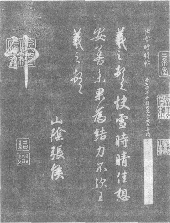 王羲之 王羲之303—361东晋最著名的书法家,被誉为“书圣”。字逸少,琅邪临沂(今山东临沂) 人,后迁山阴(今浙江绍兴)。王正之孙,王导从子,王旷之子。幼年语言迟钝,不善讲话,后来精于辞令,有辩才。少年从卫夫人(铄)学书,不到三年,笔力沉实,摇曳生姿,卫夫人赞叹说: “这孩子的书法,将来一定比我有名呵!”后来从他父亲那里见到前代名家法帖,改变初学,博采众长,草书学张芝,楷书学钟繇。又游览名山大川,看到了李斯、蔡邕、梁鸿、张昶等人的书迹,精研体势,改变汉魏古朴的书风,开创妍美流便的书体,遂臻神妙。羊欣称赞说: “古今莫二。”(《采古人能书人名》)梁武帝《古今书人优劣评》说: “王羲之书,字势雄逸,如龙跳天门,虎卧凤阙,故历代宝之。”唐太宗酷爱王羲之书法,亲为《晋书》撰写《王羲之传论》,赞扬他的书法: “详察古今,研精篆素(原指篆书于素帛,后泛称书法),尽善尽美,其为王逸少乎。”王羲之初为秘书郎、参军、长史,又为宁远将军、江州刺史,至右将军、会稽内史。世称王右军,又称王会稽。他为官清廉,关心人民疾苦,会稽发生饥荒时,他一面开仓赈济,一面向朝廷抗争,替百姓说话,并提出解决办法。《晋书》中有他给谢安写的书信,说: “所谓通识,政当随事经藏,乃有远耳。愿君每与士之下者同,则尽善矣。食无二味,居不重席,此复何有?而古人以为美谈。济否所由,实积小以致高大。君其存之。”又相传蕺山老妇人持竹扇卖20钱,王羲之给她的扇子各写五个字,让他卖100钱,人争买之。足见其高尚的品德。王羲之传世的书迹,小楷有《黄庭经》、《乐毅论》、《曹娥碑》。行书有《兰亭序》(天下第一行书)、《快雪时晴帖》(《三希堂法帖》之一)、《丧乱帖》、《孔侍帖》、《奉橘帖》、《姨母帖》、唐僧怀仁集王羲之书《圣教序》。草书有《十七帖》,被誉为 “书中之龙”,“草书圭臬”。总之,王羲之书法超神入化,秀雅绝俗,同字同旁同画,绝不雷同,就连他签名的66个“羲之”,也极尽变化之妙(见邓散木《续书谱图解》) 。