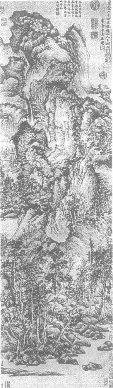 | 释义 | 王蒙《青卞隐居图》立轴,纸本,水墨。卞山在浙江吴兴县西北约十八里处。王蒙此图深得卞山奇伟苍翠之致。采用高远法构图,画面中危岩高耸,万壑千岩,密树层层。一挂瀑布从山中辗转流出,曲折回转; 近景处涧水潺潺。溪边古树高大苍茂,郁郁葱葱。一老者携杖漫步于幽幽小径。山势迤逦而上,中景左方有茅舍两间,便是隐士所居之所。
