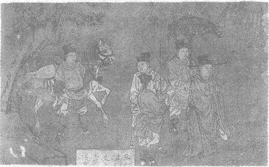 | 释义 | 王重阳故事图(会纥石烈)壁画元。纵56厘米,横88厘米。山西省芮城县永乐宫重阳殿西壁南部壁画。此幅图表现的是王重阳与太守纥石烈拜别登程,纥石烈在郊外为其送行的情景。画面上,纥石烈头戴展翅相帽,着宽袖朱袍,腰微弯,作拱手拜别状。其表情肃穆,隐约露出惜别之情。身后三名侍从为其高举华盖,另三名侍从在旁站立,其中树下的一人双腿分立,手牵一匹白马。白马马尾飘扬,双目炯炯,身体雄健,前蹄蹈踏,威风凛凛。画师表现的人物神态恰到好处,马的描绘也极为传神。