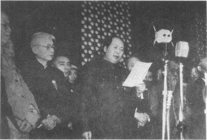 1949年10月 1 日, 毛主席在天安门城楼上宣告中华人民共和国成立 10月1日下午2时,中华人民共和国中央人民政府委员会第一次会议在北京举行,毛泽东主席,朱德、刘少奇、宋庆龄、李济深、张澜、高岗副主席及委员们宣布就职。委员会推选林伯渠为中央人民政府秘书长,接受《中国人民政治协商会议共同纲领》为中央人民政府的施政方针。任命周恩来为中央人民政府政务院总理兼外交部长,毛泽东为中央人民政府革命军事委员会主席,朱德为中国人民解放军总司令,沈钧儒为最高人民法院院长,罗荣桓为最高人民检察署检察长。会议向各国政府宣布:中华人民共和国中央人民政府为代表全中国人民的唯一合法政府,并愿意与遵守平等互利及互相尊重领土主权等项原则的任何外国政府建立外交关系。下午3时,首都30万人齐集天安门广场,庆祝中华人民共和国中央人民政府成立典礼。毛泽东主席亲自升起第一面五星红旗,庄严宣告:“中华人民共和国中央人民政府已于本日成立了。”并随即宣读了《中华人民共和国中央人民政府公告》,举行了盛大的阅兵式和群众游行。 中华人民共和国成立Zhonghuarenmingongheguochengli在马克思列宁主义、毛泽东思想指引下,中国共产党领导全国各族人民进行了28年艰苦卓绝的斗争,推翻了帝国主义、封建主义、官僚资本主义在中国的统治,建立了人民民主专政的国家政权。1949年9月21日至30日在北京举行的中国人民政治协商会议第一届全体会议,进行了创建中华人民共和国及中央人民政府的工作。27日,会议通过《中华人民共和国中央人民政府组织法》。30日,会议选举毛泽东等56人组成中央人民政府委员会,选举毛泽东为中央人民政府委员会主席,朱德、刘少奇、宋庆龄、李济深、张澜、高岗为副主席。10月1日下午2时,毛泽东主持中央人民政府委员会举行第一次会议,一致决议接受中国人民政治协商会议共同纲领为政府施政方针,选举林伯渠为中央人民政府委员会秘书长,任命周恩来为中央人民政府政务院总理兼外交部长,毛泽东为中央人民政府人民革命军事委员会主席,朱德为人民解放军总司令,沈钧儒为中央人民政府最高人民法院院长,罗荣桓为中央人民政府最高检察署检察长。下午3时,首都北京30万军民在天安门广场集合,隆重举行开国大典。毛泽东亲自升起第一面中华人民共和国国旗,并宣读中央人民政府公告,向全世界庄严宣告伟大的中华人民共和国成立。中华人民共和国的成立,标志着中国已从半殖民地半封建社会进入了新民主主义社会,开始了向社会主义过渡的时期。