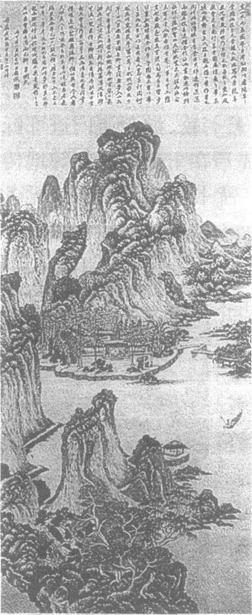 | 释义 | 王鉴《梦境图》纸本,设色。纵162.8厘米,横83.2厘米。现藏北京故宫博物院。此画采取高远法构图形式,登高望远,群峰耸峙,房屋、桥梁、江心渔夫驾孤舟垂钓、山谷小道等等,尽收眼底。远近山峰及其他形象,均实笔画出。山石以牛毛皴,峰头浓墨点苔,黑白对比强烈。自谓画梦中景色。画面自题: “画山水而兼园亭,自摩诘辋川、卢鸿草堂图始。后至元季赵文敏好写此景,绝无画院习气;叔明乃其甥也,故每效之,更加风韵。曾见其南村草堂图,为得意之笔。真迹向藏新安吴氏。后王越石持一赝作售之闲仲叔祖,得值甚厚,余正其非,遂欲退还,而越石狡甚,反谓余欲此画,故此论,叔祖信之,复珍重如天球拱璧,乏其眼而好古,未有不受人欺者,虽赏鉴小事,其中亦难言也。客岁游燕,真定梁大司马玉立,曹少司农秋岳,皆属余作草堂图,尚未有以应之。盖两先生方作长安贵人,筹边计国,何暇及此,更俟几年写以寄之,代北山移文可耳。今六月避暑半塘,无聊昼寝,忽梦入山水间,中有书屋一区,背山面湖,回廊曲室,琴书潇洒,花竹扶疏,宛似辋川轩外卷帘,清波浩渺,中流一叟乘卓垂纶,旷然自得。予趺坐中堂,观左壁画乃思翁笔,幽微淡远,不觉抚掌赞叹,遂而惊醒,鼻端拂拂犹作异香,令人有天际真人之想。嗟余焉能真有此境,便当老是乡矣。然余年已四十八,颠毛种种,纵至七十,亦不过二十年一梦耳,况未必能,又安知此梦非真境耶。起而涤砚伸纸,记境成图,不爽毫发,悬之左右,以当望梅止渴而已,掷笔惘然 。丙申(顺治十三年,即1656年)夏六月。”