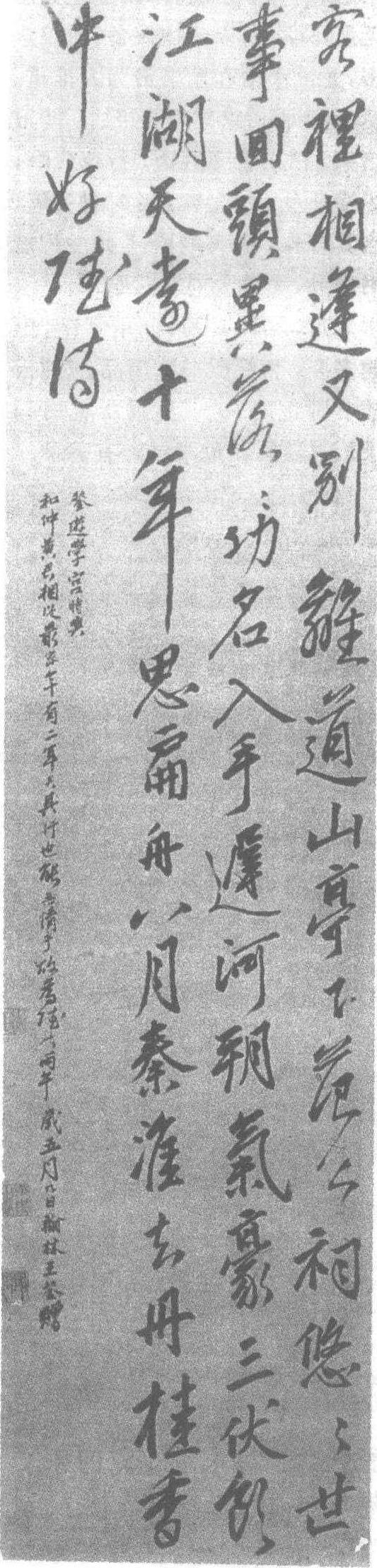 | 释义 | 王鏊行书自书诗轴明。纸本。纵139厘米,横33.3厘米。北京故宫博物院藏。王鏊(明代宗景泰元年—明世宗嘉靖三年,即公元1450—1524年),字济之,号守溪,吴县(今江苏苏州)人。乡试、会试均列榜首,廷试获第三,成化十一年(公元1475年)进士。授编修,迁侍讲学士充讲官。正德间官户部尚书,文渊阁大学士加少傅。卒赠太傅,谥文恪。博学多识,工诗文,尤以书法著称于世。有《姑苏志》、《震泽集》、《春秋词命》、《史余》等著作行世。此件作品,行书自作七律诗一首,书法清劲挺拔,得晋唐笔意,是王鏊早期佳作。