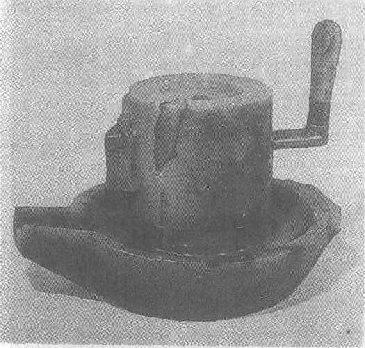 清。通高15.4厘米,纵20.9厘米,通流鋬径25.9厘米。台北故宫博物院藏。玛瑙料以灰色为主,间有黑斑和红斑。磨为圆式,仿实用的石磨琢制而成。磨盘的流、槽都碾制得极为认真。鋬的一部分为金质。磨盘造型规整,黑、红色斑将它点缀得十分美丽,质地润泽细腻,配上金鋬使器物朴素庄重之中透出富丽。