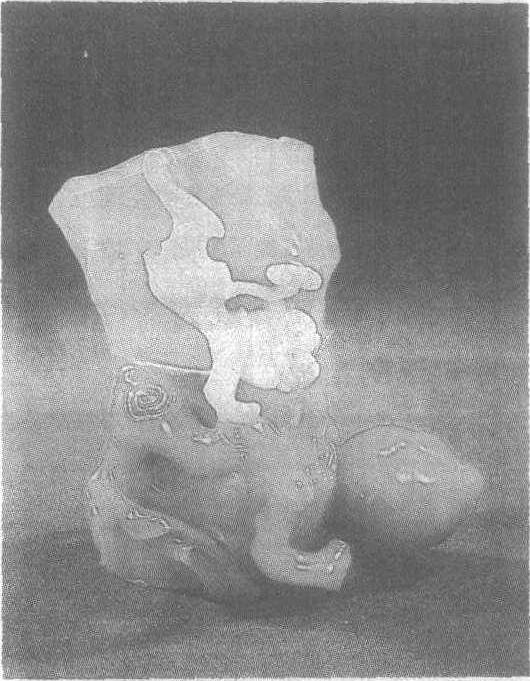 清。高9.9厘米,最宽8.8厘米。台北故宫博物院藏。器身似一截取的树干,平底、深腹,浮雕的枝叶缠绕于器身,树枝上结一桃实。器一侧雕一蝙蝠,口中衔灵芝。此洗生活气息浓厚,又具强烈的艺术感染力。器身桃实呈红色,蝙蝠呈白色,两者均晶莹透亮,红白对比强烈,光彩夺目,鲜艳美丽。
