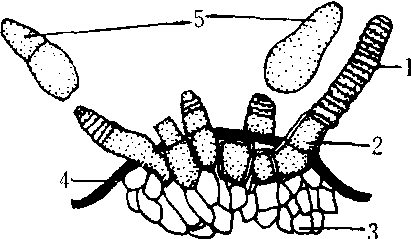 环黑星孢属 1.产孢细胞 2.分生孢子梗3. 子座 4. 寄主角质层 5. 分生孢子 |