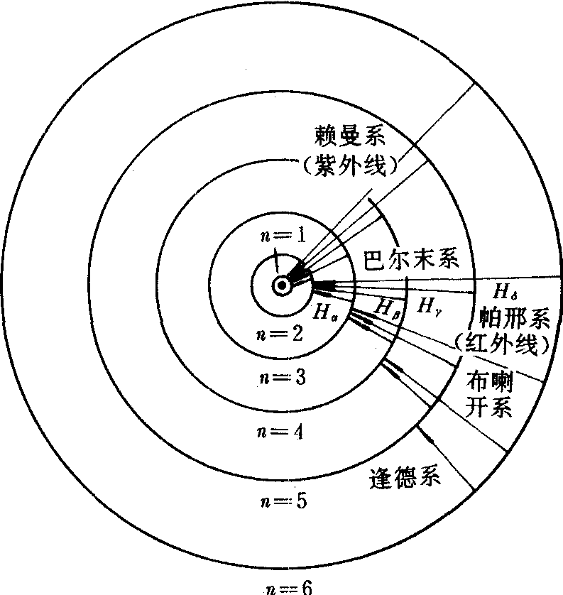 | 释义 | 玻尔轨道boer guidao玻尔理论中电子绕核运动的稳定轨道。按照玻尔理论,原子的不同能量状态对应电子的不同运行轨道。由于原子的能量状态是不连续的,因而电子的轨道也是不连续的。电子只能在满足条件:P=n·h/2π(P为电子的角动量,h为普朗克常量,n为正整数)的轨道上运动。电子在这些轨道上运动时处于稳定状态,不向外辐射能量。只有当电子从具有较高能量的轨道上跃迁到较低能量的轨道上时,才辐射能量。辐射的能量为这两条轨道所对应的能量差。氢原子的玻尔轨道如图所示。它是一组分立的、以原子核为圆心的同心圆。各轨道半径及所对应的能量可用式:rn=n2r1、En=1/n2E1计算。式中n=1,2,3……,r1为离核最近的一条轨道的半径,其值为r0=0.529×10-10米,称为玻尔半径,E1为基态能量,其值为-13.6电子伏特。