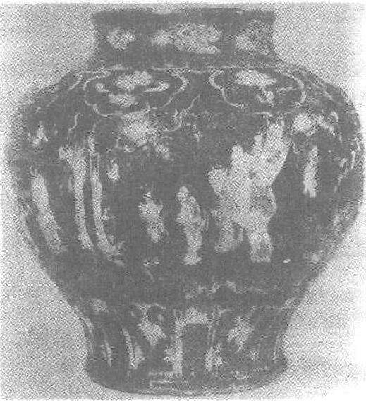 | 释义 | 珐华人物陶罐明。高37.5厘米,口径17厘米。山西省运城地区博物馆藏。此罐直口,丰肩,腹部以下迅疾内收。造型端庄,线条优美,富有韵律感。胎为红陶所制,罐内涂绿色,外表则以紫色为底,以黄、蓝、绿等色做出图案纹饰。颈部饰朵云纹,肩部和近底处是二方连续的莲花纹。在这些富有装饰性的边框纹饰间是罐腹部的主体纹饰,共分四组,表现的是文人骚客及官宦人家琴、棋、画、游的场面,画面之间以林木、山石相隔。抚琴图中一美女在专注地抚琴,旁有五人观看聆听。对弈图中,二人在亭内对坐下棋,另一人扶桌而立。赏画图中有几人对腊梅图观赏品评。出行图在四幅图中场面最大,一马上人正挥手告别,前有马僮,后有侍从,远处有三人送别。衬景是明代形制的牌坊。这些画面意境清逸高雅,人物生动传神,色彩绚丽而庄重。此件珐华罐从造型到图案均为精工细制.是山西珐华器中的精品。珐华见“珐华高士图梅瓶”条目。