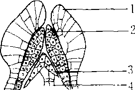 浮萍胚珠顶部纵切面 1. 外珠被 2. 内珠被 3. 珠心冠 4. 胚的一部分 |